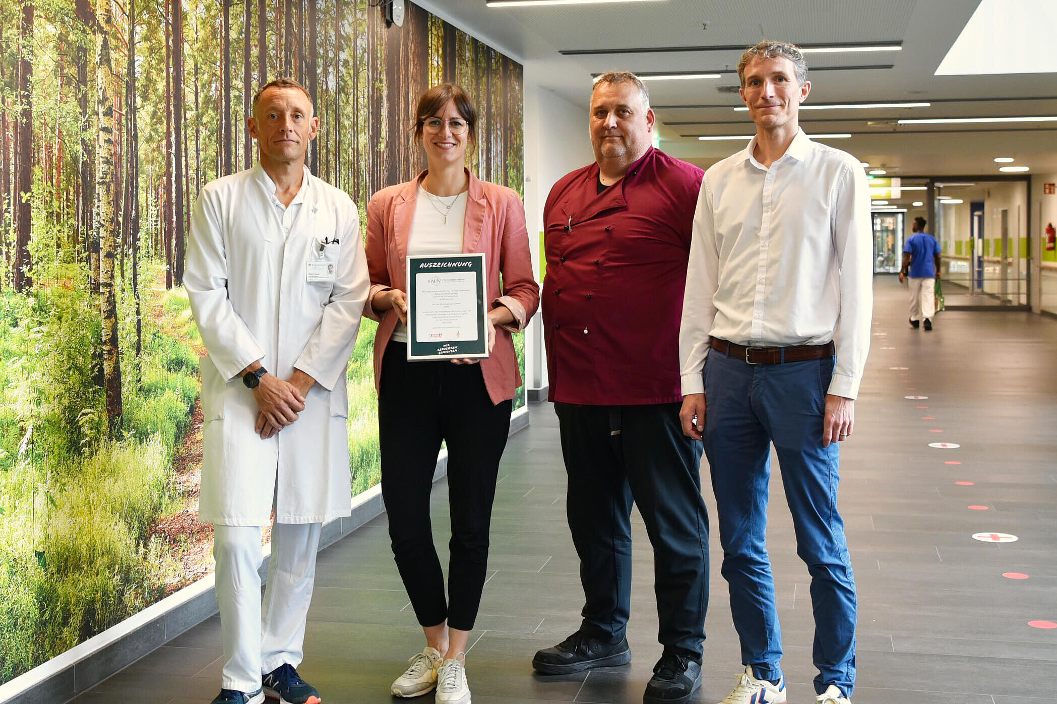 Bild (v. l.): Martin Bauer, Ernährungsberater, Dr. Manon Wicking, Nachhaltigkeitsmanagerin, Holger Sendowski, Küchenleiter, Pascal Eller, Verwaltungsdirektor - Bildnachweis: Bergmannsheil